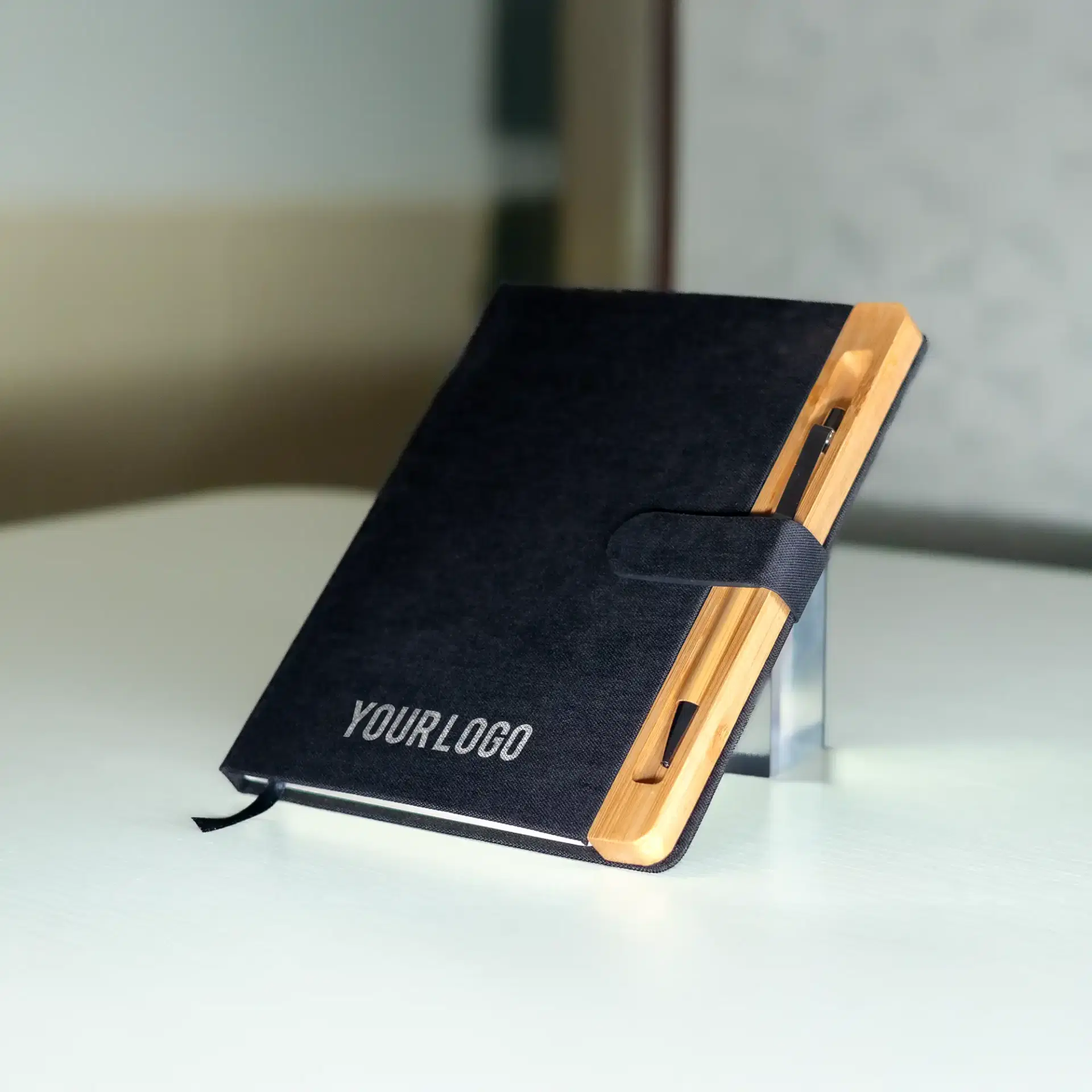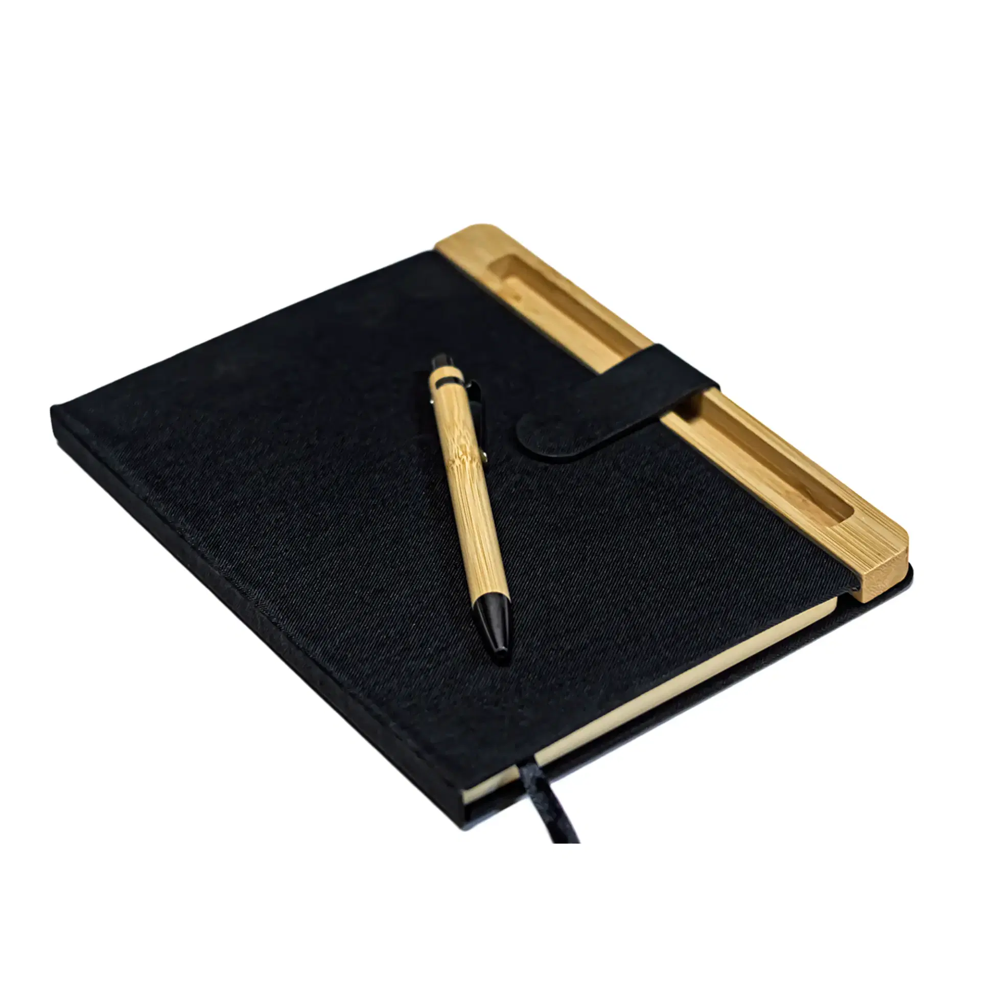 An eco-conscious notebook made from RPET and bamboo, featuring a magnetic closure and bamboo pen