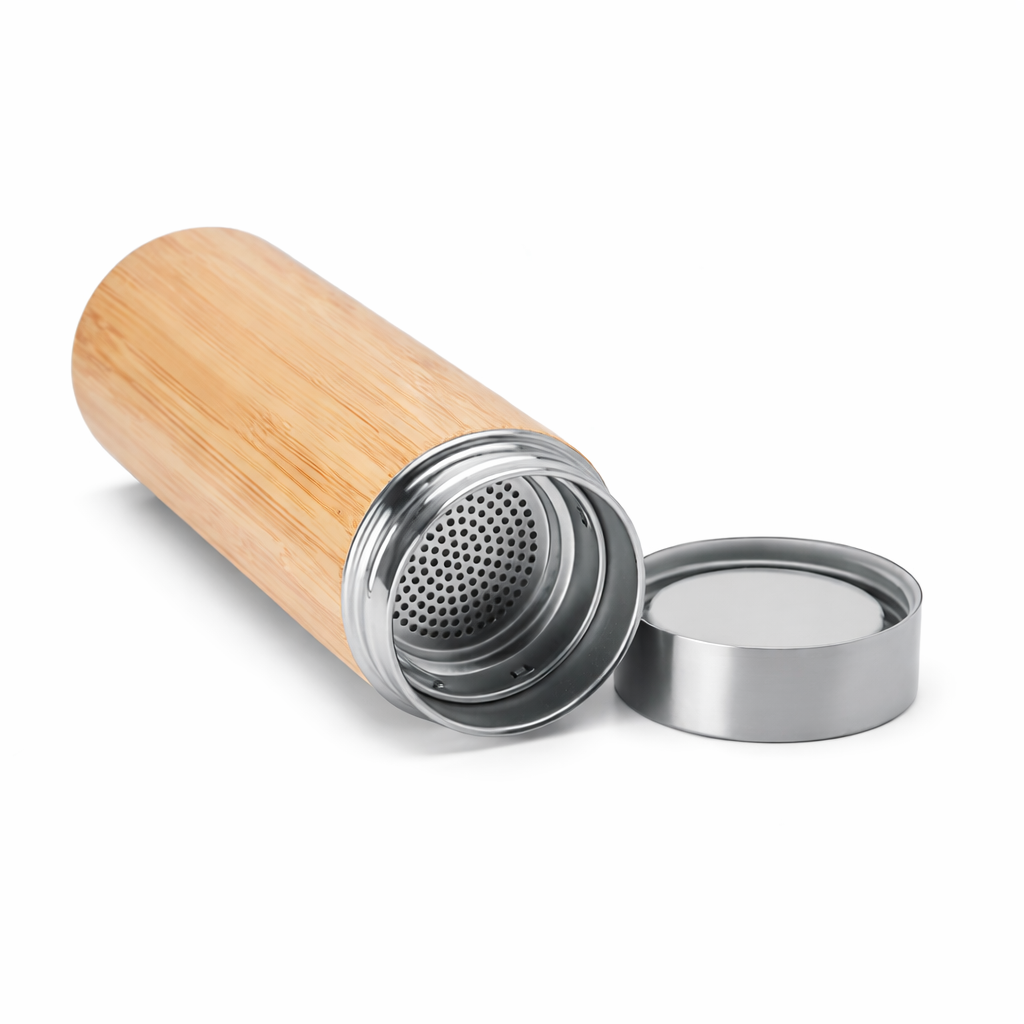 Double wall stainless steel insulating vacuum flask with bamboo cover and additional tea infuser. Capacity: 400 ml. Bamboo is a natural product.