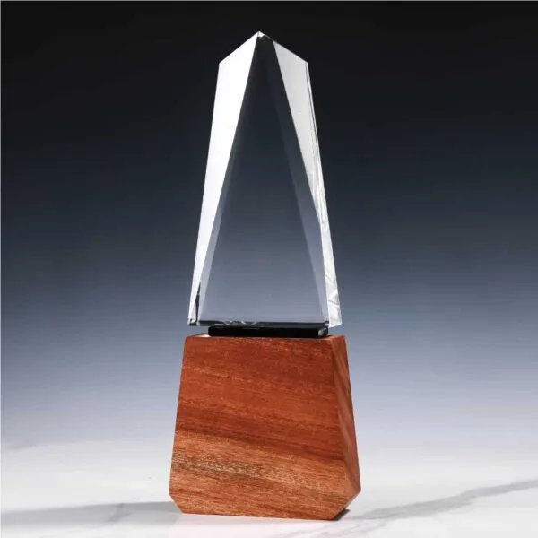 Crystal tower award on a hardwood base, symbolizing growth, achievement, and excellence. Crafted from premium crystal and natural wood, fully customizable with engraving and supplied in a mahogany wooden presentation box with gold clasp.