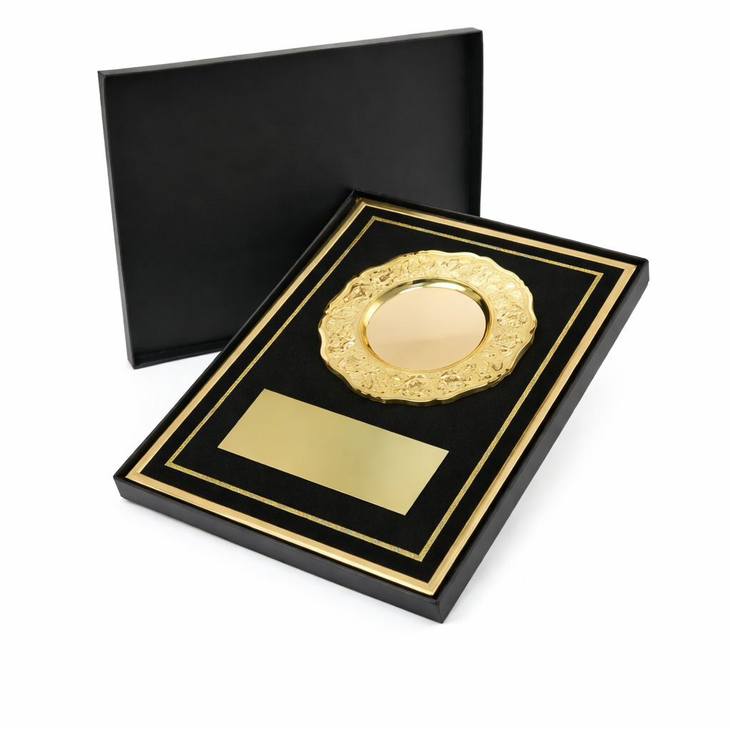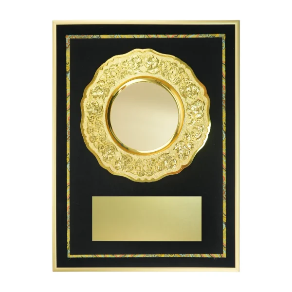 A3 aluminum award plaque with a premium black velvet finish and round engraved gold plate, ideal for corporate awards and special recognitions. Supplied in a black hardboard presentation box for an elegant finish.