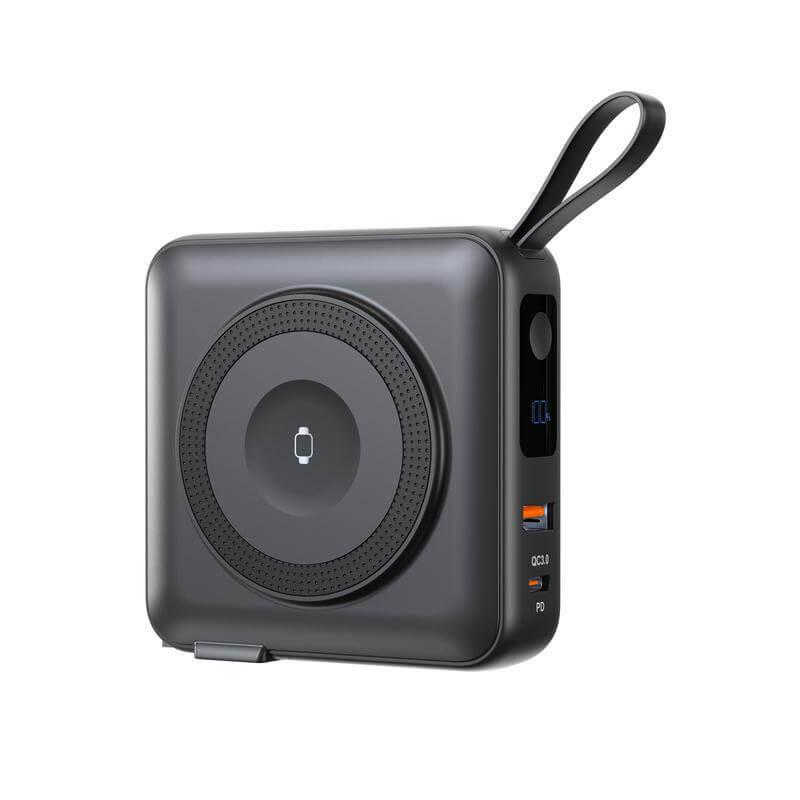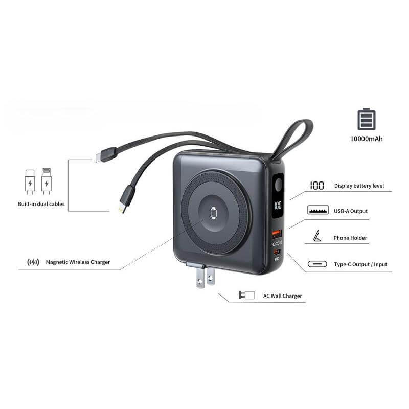 6-in-1 Powerbank & Charger with 10,000mAh battery, 15W magnetic wireless charging, built-in Type-C & Lightning cables, 20W PD fast charge, and global travel adaptors.